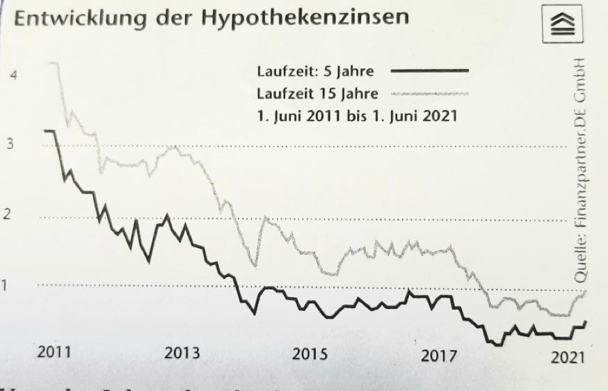 Der langfristige Blick zurück zeigt, wie günstig Finanzierungen derzeit sind. Im April 2011 wurde für einen Kredit mit den genannten Standarddaten eine Monatsrate von 803 € fällig, vor fünf Jahren waren es 454 €. Darlehensnehmer können zurzeit noch relativ entspannt auf die Zinsentwicklung blicken. Die leicht gestiegene Inflation gerät jedoch allmählich deutlicher ins Blickfeld. Damit verbunden ist die Erwartung von möglichen Zinserhöhungen der Notenbanken und in der Folge von höheren Bauzinsen.